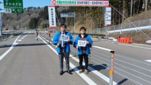 2026年3月23日 / 最終更新日 : 2026年3月23日 二ツ井町商工会 「きみまち阪IC~北秋田今泉IC」開通式通り初めのお見送りに参加してきました! 秋田自動車道のきみまち阪IC~北秋田今泉ICが、3月20日(金)ついに開通しました。当会青年部は地域関係者と共に、高速道通り初めのお見送りに参加し、新しい道路に対する期待感や達成感、喜びを分かち合いました。今後、高速道開通に伴う地域の交通利便性向上をチャンスに、当会青年部は地域活性化のイベント等を企画してまいります。 260320120617657 260320123227137